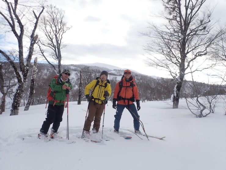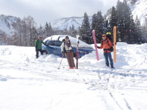 1/1。夜半過ぎには大雪は収まったようで、テントの埋没もほどほどだった。軽雪でリセットされた上部は魅力的ではあったが、そんな元気はなく帰路につく。往路から変えて、山神杉からは一気に尾根を国道へ降る。重荷ながら少しばかりの快適滑降を楽しんだのも束の間、痩せ尾根のトラバースが最後の難関。西田さんをトップに絶妙なルート取りで巻き降れば国道に出た。最後の林道では再び脛~膝丈のラッセルをこなして、入叶津集落に下山。国道に出る頃には我々を祝福するかのような温かな日が出ていた。