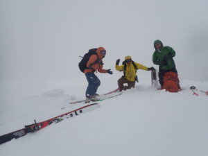 12/31。午後から荒天の予報に出発を早める。前日のトレースを使って主尾根までは快速。主尾根上は適度な傾斜でどんどん進む。時折日も差し込む高曇りで、会越の山々をきょうも見渡せる。森林限界で装備をを調え、いざ山頂へ。心配したシュカブラはほとんどなかったものの、時折突風が吹き、登るほどに視界がなくなる。後藤さんが力強く先頭を引き頂上稜線にでる。100m水平移動して山頂。新潟側からは雪風が吹き付けて痛い。集合写真をとってそそくさと山頂を後にする。山頂到着とほぼ同時に視界が完全になくなり、若干右往左往しながら森林限界まで戻る。あとは程よい傾斜のブナ林を快適滑降。猿崖まで戻った12時ちょうどから大粒の雪が降り始め(後から天気図を見たら寒冷前線が通過していた)、昼過ぎにはテン場に戻る。テントが埋まるような大雪のなかで空焚きパーティー。2度の除雪は堪えたけれど、食べ物も豊富で快適な大晦日だった。みな10時前には眠りについてしまったようだ。